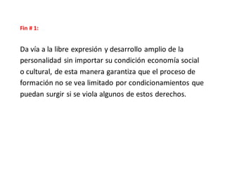 El documento presenta 13 fines de la educación. Entre ellos se encuentran garantizar la libre expresión y desarrollo de la personalidad sin importar condiciones económicas o sociales; enseñar sobre los derechos humanos para formar personas íntegras; entender la democracia como método para resolver situaciones sociales; conocer la historia y cultura colombiana; y tener acceso a evidencias tecnológicas para aplicarlas y desarrollarse continuamente. También incluye fines como reconocer la diversidad étnica y cultural; vincular