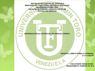 Este documento presenta una introducción a las ciencias jurídicas. Explica que el iusnaturalismo se refiere a las leyes morales naturales derivadas de la naturaleza humana. Además, describe que la disciplina jurídica incluye el derecho, la ética y la justicia. Finalmente, lista varias ramas del derecho como el derecho penal, civil, administrativo y constitucional.