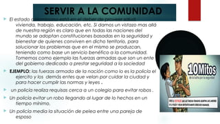 El documento describe los fines y deberes del estado colombiano. Los fines principales son servir a la comunidad mediante la provisión de servicios básicos como salud, vivienda y educación, y promover la prosperidad general a través de políticas económicas que generen empleo y crecimiento. Entre los deberes de los ciudadanos se encuentran respetar los derechos ajenos, participar en la vida cívica y política, y proteger los recursos naturales. Se argumenta que los derechos más vulnerados son el respeto a los derechos de
