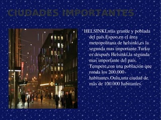 Las principales ciudades de Finlandia son Helsinki, la capital y ciudad más grande, Espoo, la segunda ciudad más grande en el área metropolitana de Helsinki, y Turku, la tercera ciudad más grande. Otras ciudades importantes son Tampere con unos 200,000 habitantes y Oulu con más de 100,000 habitantes. Finlandia tiene una población de aproximadamente 5.3 millones de habitantes y adoptó el euro como moneda oficial en 1999.