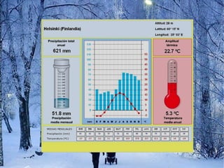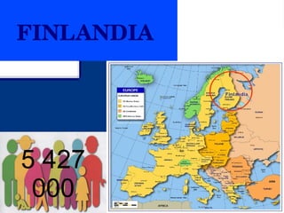 Finlandia tiene un clima polar en el norte y continental en el sur, con inviernos fríos y veranos más cálidos. Algunas de las principales ciudades son Helsinki, Jyväskylä, Turku y Oulu. Los finlandeses disfrutan de actividades al aire libre como piragüismo y esquí de fondo. La música rock de bandas como The Rasmus y el heavy metal de Lordi son populares, y Finlandia ha ganado el Festival de la Canción de Eurovisión.