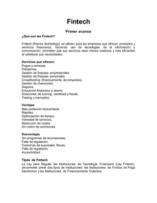 El documento proporciona información sobre las Fintech. Explica que las Fintech son empresas que ofrecen servicios financieros utilizando tecnología, lo que puede hacerlos más baratos y eficientes. Describe los tipos de servicios que ofrecen, las ventajas y desventajas, y los tipos de Fintech reconocidos por la ley mexicana como Instituciones de Financiamiento Colectivo e Instituciones de Fondos de Pago Electrónico. También resume brevemente la historia y el crecimiento reciente de las Finte
