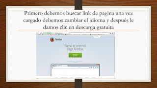 El documento proporciona instrucciones para instalar Firefox e instalar complementos, incluyendo Download Helper, para descargar videos de YouTube. Primero se debe buscar e instalar Firefox, luego se puede transferir datos de otro navegador o finalizar la instalación. Para instalar complementos como Download Helper se accede al menú de complementos y se instala el complemento deseado para poder descargar videos de YouTube.