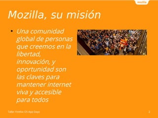 Este documento presenta información sobre Firefox OS. Resume la historia y evolución de Firefox OS desde 2010, cuando se presentó el proyecto SeaBird, hasta la actualidad. También describe la arquitectura de Firefox OS y las capas que la componen, así como las herramientas de desarrollo y las diferentes Web APIs disponibles para crear aplicaciones.