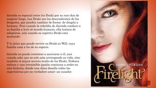 Jacinda es una Draki, descendiente de dragones que pueden cambiar de forma entre humanos y dragones. Su don de respirar fuego la hace especial. Cuando la rebeldía de Jacinda lleva a su familia a huir al mundo humano, ella trata de adaptarse aunque su espíritu Draki se está muriendo. Lo único que puede revivir su Draki es Will, cuyo familia caza a los Draki, aunque sabe que estaría arriesgando su vida y el secreto de los Draki.