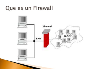 Este documento describe los diferentes tipos de firewalls, incluyendo filtros de paquetes, filtros de circuito y filtros a nivel de aplicación. Explica que un firewall protege la red mediante el control de acceso a los recursos de la red, el control de uso de Internet y la concentración de la seguridad. También describe esquemas comunes de firewall como la protección de host, firewall personal y firewall de DMZ.