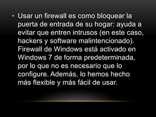 El documento describe las funciones y configuración del Firewall de Windows. Explica que el firewall ayuda a prevenir la entrada de hackers y software malintencionado de forma similar a como una puerta bloquea la entrada a un hogar. Indica que en Windows 7 el firewall está activado de forma predeterminada y ofrece cuatro opciones de configuración personalizables para cada tipo de red. Proporciona instrucciones para acceder a la configuración del firewall a través del Panel de control y ajustar los detalles de protección para cada perfil de red: hogar, trabajo y público.