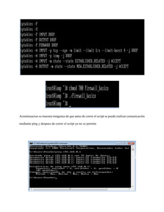 El documento describe cómo configurar un firewall básico y NAT con iptables en Linux. Para el firewall básico, el script elimina reglas existentes, establece políticas de entrada, salida y enrutamiento como DROP, y agrega reglas para permitir conexiones establecidas y relacionadas mientras bloquea ping y ataques DoS. Para NAT, el script habilita enrutamiento, elimina reglas, establece políticas de entrada, salida y NAT como ACCEPT, y agrega reglas para aceptar tráfico de loopback, la LAN, y masquerade para la