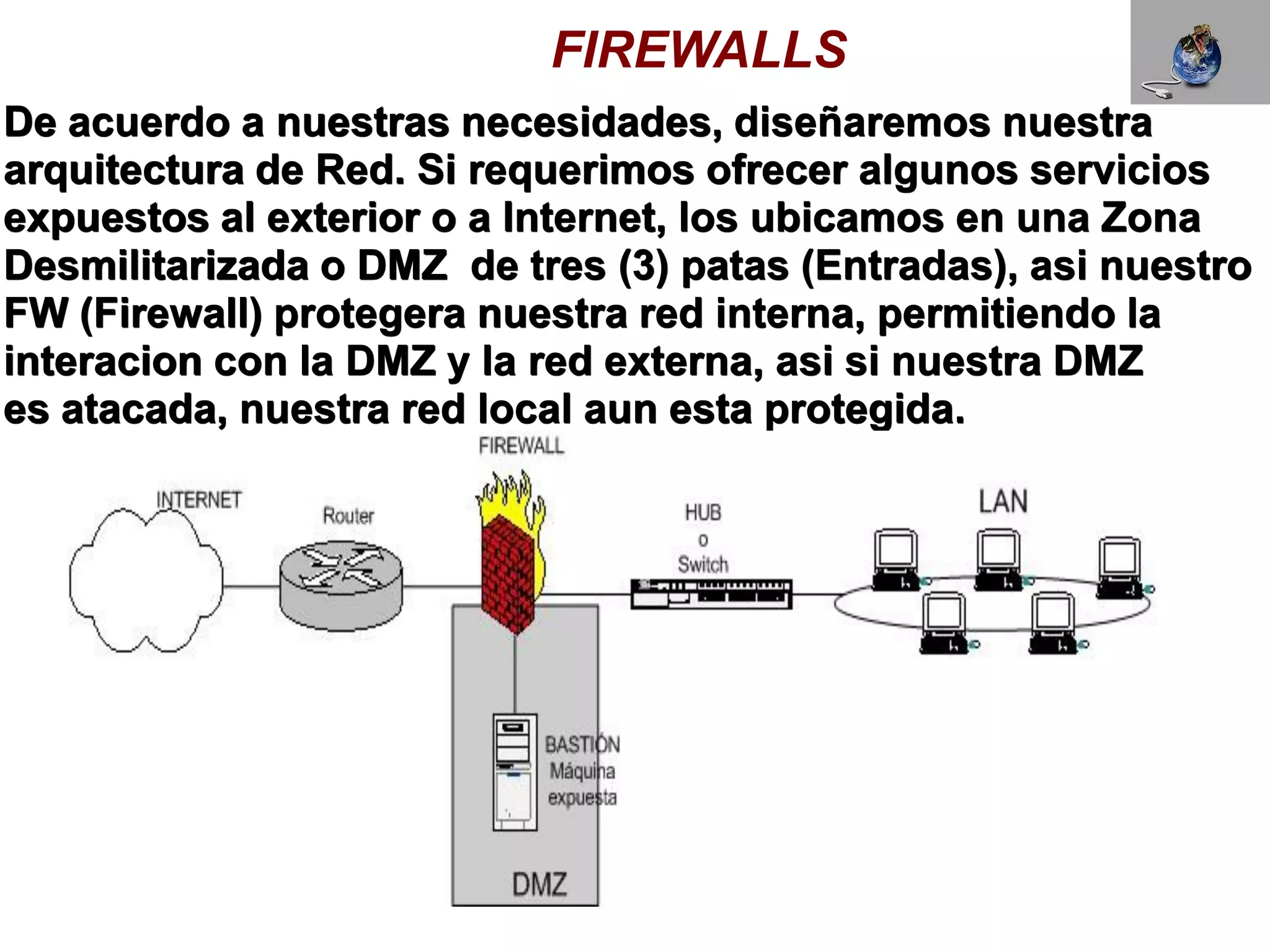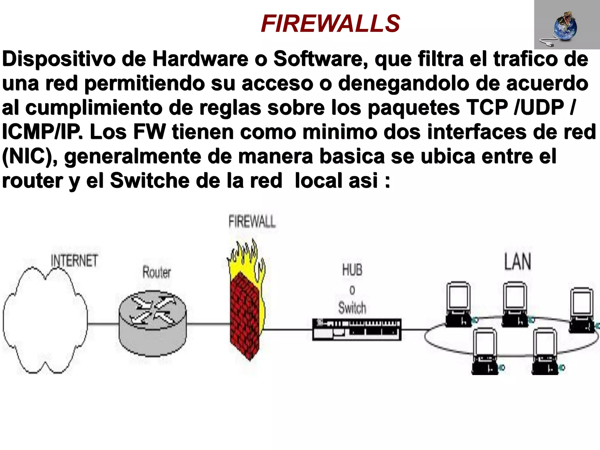Un firewall es un dispositivo de hardware o software que filtra el tráfico de red entrante y saliente de acuerdo a reglas predefinidas. Los firewalls tienen por lo menos dos interfaces de red y se ubican entre el router y los switches de una red para proteger la red interna. Existen dos políticas principales para los firewalls: aceptar todo excepto lo específicamente bloqueado, o bloquear todo excepto lo específicamente permitido, siendo esta última la más recomendada. Iptables es un firewall integrado en el kernel de Linux que permite configurar reg