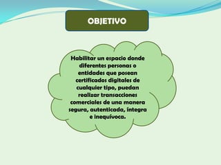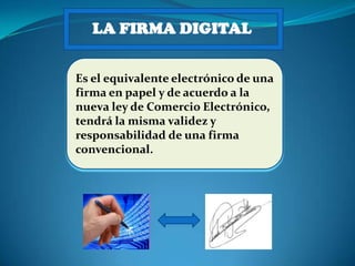 La firma digital es el equivalente electrónico de una firma en papel y tiene la misma validez y responsabilidad legal. Su objetivo es habilitar transacciones comerciales seguras y autenticadas entre personas u organizaciones con certificados digitales a través de páginas web o documentos electrónicos dentro de entornos corporativos o entre individuos.