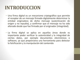 La firma digital es un mecanismo criptográfico que permite autenticar el origen de un mensaje y verificar que no ha sido alterado, proporcionando seguridad e integridad equivalentes a una firma manuscrita. Se basa en el uso de claves criptográficas pública y privada asociadas a un individuo de forma única. La ley peruana otorga validez legal a las firmas digitales realizadas a través de una infraestructura de certificación oficial.