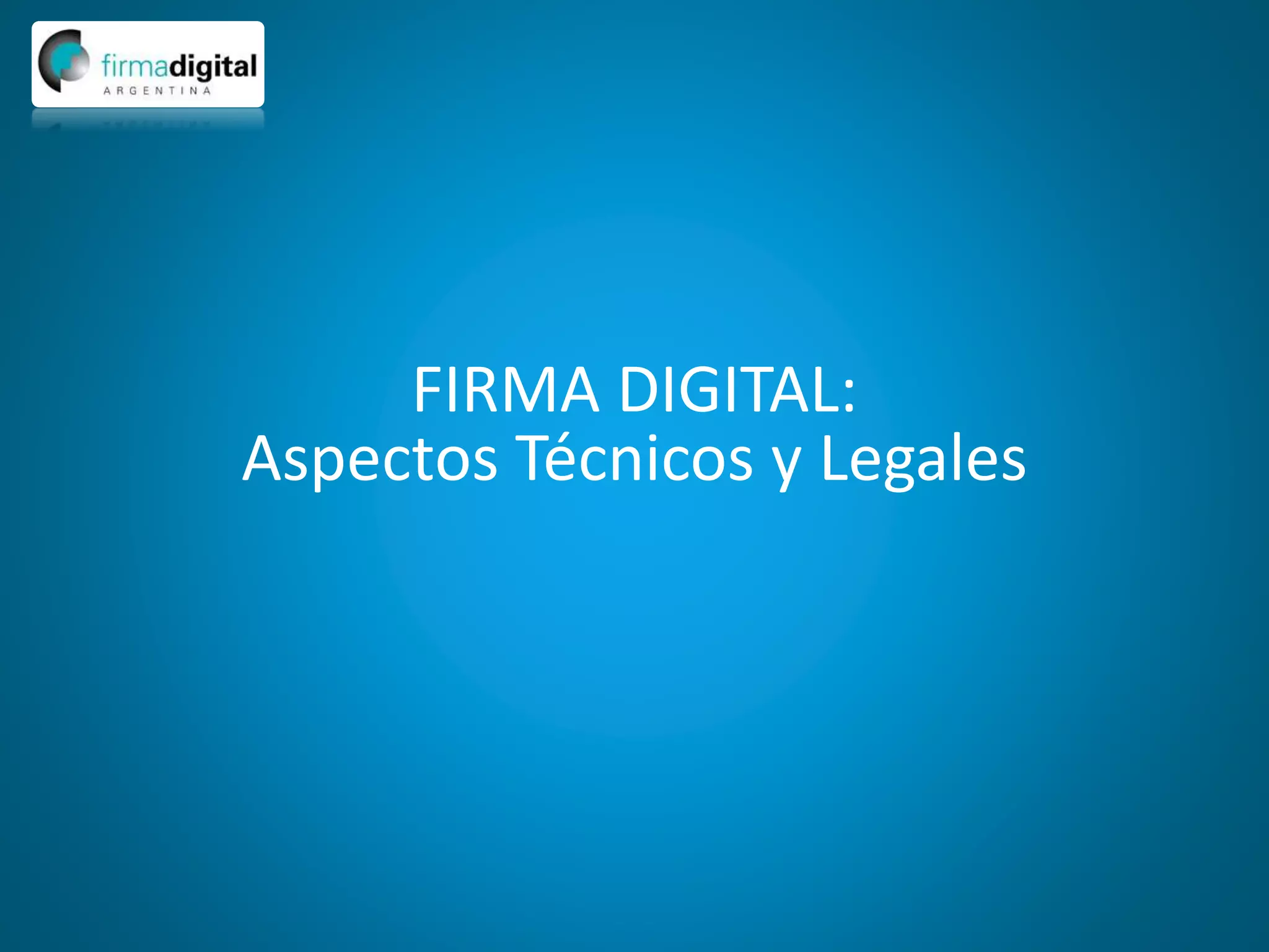 El documento presenta una introducción a la firma digital, incluyendo conceptos básicos, funcionamiento y marco normativo en Argentina. Explica que la firma digital permite autenticar el origen y verificar la integridad de un mensaje de manera demostrable ante terceros mediante criptografía asimétrica. También describe los componentes de una infraestructura de firma digital como certificados, autoridades certificantes, y aplicaciones como trámites gubernamentales y compras electrónicas.