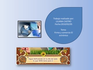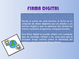 Este documento describe la firma digital, su origen y aplicaciones. La firma digital se obtiene cifrando un documento digital con una clave privada y permite verificar la integridad del mensaje y autenticar su origen. Se usa comúnmente en transacciones electrónicas como compras en línea, trámites gubernamentales y bancarios.