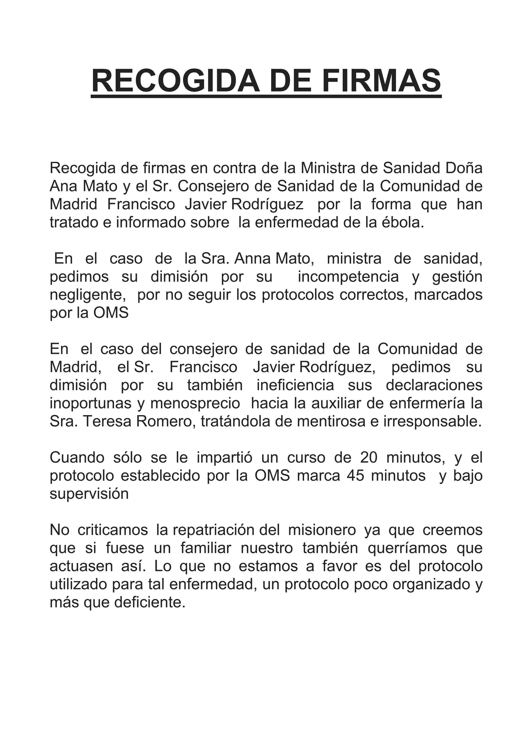 Este documento pide la dimisión de la Ministra de Sanidad Ana Mato y del Consejero de Sanidad de la Comunidad de Madrid Francisco Javier Rodríguez debido a su incompetencia y gestión negligente en el manejo de la enfermedad del ébola. También critica las declaraciones menospreciativas de Rodríguez hacia la auxiliar de enfermería Teresa Romero y el protocolo deficiente utilizado para tratar la enfermedad.