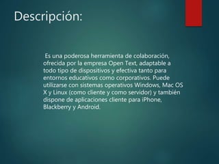 Este documento describe una poderosa herramienta de colaboración de Open Text que puede utilizarse en entornos educativos y corporativos en múltiples sistemas operativos y dispositivos. Ofrece funciones como mensajería instantánea, correo electrónico, calendarios, archivos compartidos, blogs y foros para más de 9 millones de usuarios en todo el mundo.