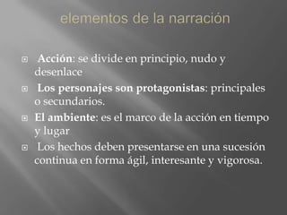 El documento describe diferentes tipos de narrativa, incluyendo narrativa, descriptiva, expositiva y dialogada. También describe los elementos clave de una historia como el principio, nudo y desenlace, personajes principales y secundarios, y el ambiente. Además, explica la técnica descriptiva y cómo se puede aplicar a biografías, prosopografías, etopeyas, retratos y topografías. Finalmente, define resúmenes, informes y ensayos.
