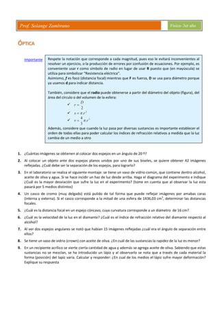 El documento presenta 9 preguntas sobre óptica relacionadas con la formación de imágenes en espejos, la refracción de la luz al pasar por diferentes medios, y el cálculo de distancias focales y velocidades de la luz. También recomienda el uso adecuado de notación y símbolos al resolver problemas ópticos e indica que es importante establecer el orden en que la luz pasa por diferentes sustancias para calcular índices de refracción relativos.