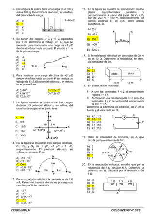 Este documento contiene 20 preguntas sobre conceptos básicos de física como carga eléctrica, campo eléctrico, potencial eléctrico y corriente eléctrica. Las preguntas abarcan temas como las propiedades de la carga eléctrica, fuerzas entre cargas, campo eléctrico creado por distribuciones de cargas, trabajo realizado por campos eléctricos, y circuitos eléctricos simples. El documento parece ser parte de un examen o cuestionario sobre conceptos fundamentales de electromagnet