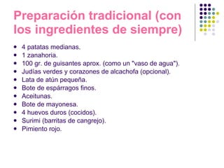 La ensaladilla rusa es una receta tradicional española que incluye patatas, zanahorias, guisantes, huevos duros, atún, espárragos, aceitunas y mayonesa. Se prepara herviendo la verdura y los huevos, mezclando los ingredientes con mayonesa y refrigerándola para que coja sabor. Suele servirse como tapa en los restaurantes acompañada de una cerveza.