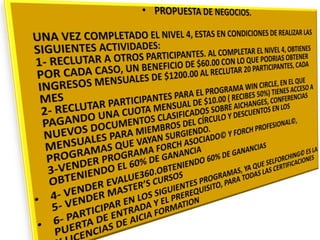 El documento aborda el proceso de forching como un enfoque para empoderar a las personas a enfrentar desafíos mediante la gestión efectiva de recursos como tiempo, circunstancias y decisiones. Se describe un programa de certificación en cuatro niveles para desarrollar habilidades de autoformación y liderazgo personal, promoviendo la independencia y la capacidad de actuar en situaciones inciertas. El objetivo final es formar ciudadanos del mundo que puedan identificar y aprovechar oportunidades en su vida.
