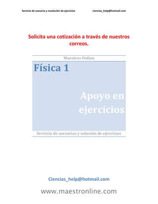 Este documento proporciona información sobre un servicio de asesoría y resolución de ejercicios de ciencias. Incluye detalles de contacto como una dirección de correo electrónico y un sitio web para obtener más información. También describe dos actividades relacionadas con la cinemática que involucran el uso de un simulador de movimiento y la construcción de gráficas.