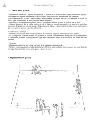 Este documento presenta 9 juegos para el calentamiento en educación física. Los juegos incluyen actividades como correr, botar pelotas, pasarse pelotas y evadir a perseguidores para activar a los estudiantes al comienzo de la clase de una manera divertida y jugada antes de realizar estiramientos y ejercicios más específicos. Cada juego incluye instrucciones detalladas y consejos para su implementación. Los juegos buscan calentar el cuerpo de una manera entretenida para los estudiantes antes