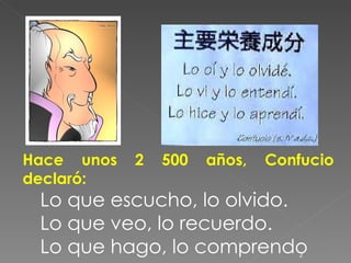 El documento presenta información sobre el aprendizaje activo y el movimiento rectilíneo. Explica que para aprender algo bien, es necesario escuchar, ver, hacer preguntas y practicarlo. Luego clasifica diferentes tipos de movimiento como uniforme, uniformemente acelerado y variado, y describe las ecuaciones cinemáticas que definen la posición, velocidad y aceleración de un objeto en movimiento rectilíneo.