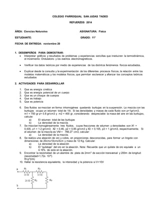 Este documento presenta 20 actividades de refuerzo en física para un estudiante de grado 11°, incluyendo problemas sobre energía cinética y potencial, choques de cuerpos, trabajo y potencia, termodinámica, ondas electromagnéticas, circuitos eléctricos y óptica. El estudiante deberá responder cada actividad de forma manuscrita y presentar el trabajo en hojas tamaño carta para su evaluación.