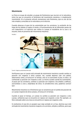 El documento describe el fenómeno del movimiento mecánico, definido como el cambio de posición de un cuerpo respecto a otros al transcurrir el tiempo. Explica que el movimiento puede ser unidimensional, bidimensional o tridimensional dependiendo de la forma de la trayectoria, y que la velocidad es una magnitud vectorial que representa el valor, sentido y dirección del movimiento. Finalmente, analiza gráficas que representan la relación entre distancia y tiempo para diferentes tipos de movimiento.