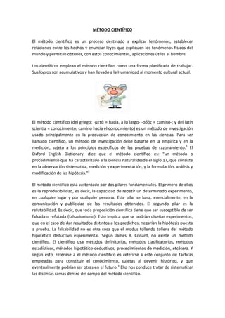 El documento describe el método científico y sus pasos. Explica que el método científico implica la observación sistemática, medición y experimentación para formular y probar hipótesis. Los pasos incluyen la observación de un fenómeno, la formulación de una hipótesis, la realización de experimentos para probar la hipótesis, el desarrollo de una teoría si la hipótesis es validada, y la creación de una ley si la teoría es confirmada experimentalmente. También presenta un ejemplo de experimento sobre