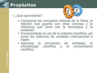 Este documento presenta los conceptos básicos de la asignatura de Física I. Explica que la física estudia los fenómenos naturales que ocurren en la materia, energía, espacio y tiempo. También describe cómo la física se relaciona con otras ciencias y su importancia para la tecnología y la sociedad. Finalmente, introduce conceptos clave como sistemas físicos y coordenadas cartesianas que serán fundamentales para el curso.