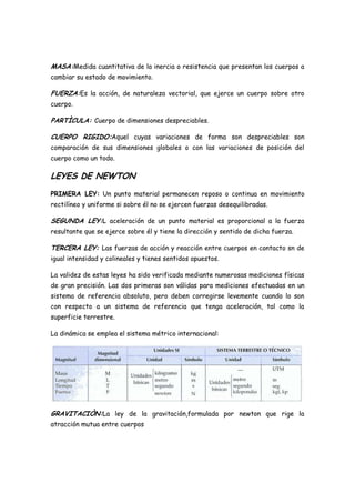 Este documento introduce los conceptos fundamentales de la dinámica, incluyendo fuerzas, leyes de Newton, energía mecánica y más. Explica que la dinámica analiza cómo evolucionan los sistemas sobre el tiempo debido a fuerzas que causan cambios en su estado. También describe conceptos clave como espacio, tiempo, masa, fuerza, partícula, cuerpo rígido y las tres leyes de Newton. Finalmente, cubre temas como gravitación, trabajo mecánico, potencia mecánica y energía mecánica.