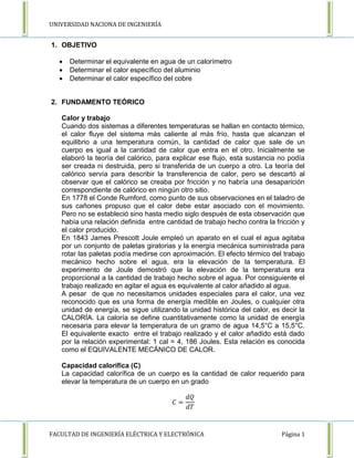 Este documento describe un experimento para determinar el equivalente en agua de un calorímetro, y el calor específico del aluminio y cobre. Se determinó que el equivalente en agua del calorímetro fue de 20,71 g. El calor específico del aluminio se calculó en 0,23 y 0,227 cal/g°C, con errores del 7,82% y 6,61%. El calor específico del cobre fue de 0,099 y 0,1 cal/g°C, con errores de 5,05% y 6%.
