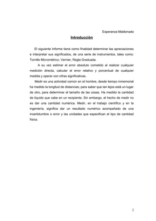 Este documento presenta los resultados de un experimento de física en el que se midieron varias magnitudes físicas utilizando instrumentos como regla graduada, tornillo micrométrico y vernier. Se calculó el error absoluto, relativo y porcentual de cada medición. También se realizaron cálculos indirectos como perímetro, área y volumen propagando los errores. Al final, se concluye que toda medición tiene un error y los resultados son aproximados debido a factores como la calibración de los instrumentos y condiciones ambientales.