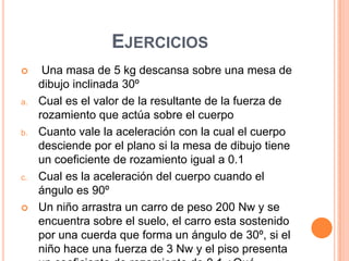 El documento presenta varios ejercicios relacionados con la segunda ley de Newton aplicada a objetos en reposo o en movimiento sobre superficies inclinadas. Se calculan valores de fuerzas de rozamiento, aceleraciones y tensiones en cuerdas para diferentes situaciones donde se dan masas, coeficientes de rozamiento y ángulos de inclinación.