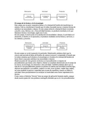 Este documento resume las diferencias entre ciencia, técnica y tecnología. Define la ciencia como la actividad de investigación y sus resultados como el conocimiento científico. La técnica se refiere a los procedimientos para lograr un resultado, mientras que la tecnología es el conjunto de conocimientos y procesos para producir bienes y servicios. También clasifica las ciencias en formales y fácticas, dando ejemplos de cada una, y señala que la física y la química comparten ser ciencias naturales aunque se diferencian