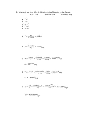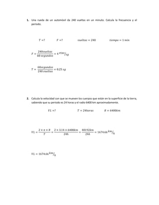 Este documento contiene varios problemas de cinemática que involucran el cálculo de periodo, frecuencia, velocidad angular y aceleración circular para objetos que giran o se mueven en círculo, como ruedas de automóviles, hélices de aviones, manecillas de reloj y poleas. Se demuestra la relación entre aceleración circular y velocidad angular.
