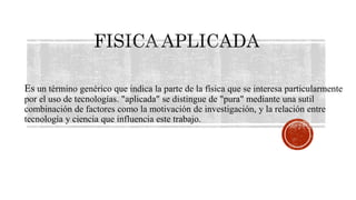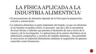 El documento analiza las aplicaciones de la física en la industria alimentaria y agrícola. En la industria alimentaria, la física se aplica en procesos como la cocción, conservación y deshidratación de alimentos utilizando diferentes métodos de transferencia de calor. En la agricultura, la física es relevante para el estudio de suelos, sistemas de riego, maquinaria y meteorología, los cuales afectan significativamente el rendimiento y calidad de los cultivos.