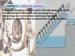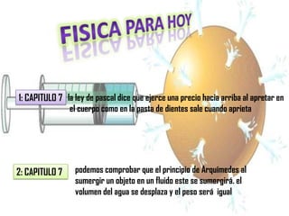 La ley de Pascal explica que la presión se transmite en todos los sentidos a través de un fluido, como se demuestra cuando sale pasta de dientes al apretar el tubo. El principio de Arquímedes establece que un objeto sumergido en un fluido experimenta un empuje ascendente igual al peso del fluido desplazado. El tornillo de Arquímedes, un tubo helicoidal que gira, puede elevar agua mediante la aplicación continua del principio de Arquímedes.