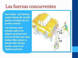 Este documento describe los conceptos fundamentales relacionados con el equilibrio bajo la acción de fuerzas concurrentes. Explica que las fuerzas concurrentes son aquellas cuyas líneas de acción pasan a través de un punto común, y que para que un objeto esté en equilibrio, la suma vectorial de todas las fuerzas externas que actúan sobre él debe ser cero. También define diferentes tipos de fuerzas como la fuerza de peso, tensión, fricción y normal, y describe los coeficientes de fricción cinética y estática. Por último, explic