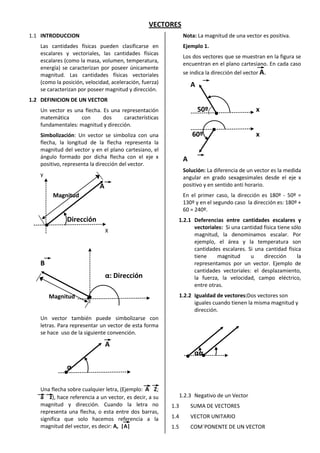 Este documento introduce los conceptos básicos de los vectores. Explica que los vectores tienen magnitud y dirección, mientras que las cantidades escalares solo tienen magnitud. Define un vector como una flecha cuya longitud representa la magnitud y cuyo ángulo respecto al eje x representa la dirección. También explica cómo representar vectores con letras y la diferencia entre cantidades escalares y vectoriales.