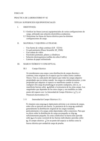 Este documento describe un experimento de laboratorio para determinar las líneas equipotenciales y de fuerza eléctrica para diferentes configuraciones de carga. Los estudiantes usarán una solución electrolítica conductora y electrodos puntuales, planos y cilíndricos para graficar las líneas equipotenciales y de fuerza eléctrica. El documento también explica conceptos teóricos como campo eléctrico, potencial eléctrico y superficies equipotenciales.