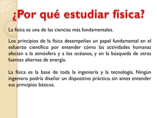 La física es una de las ciencias más fundamentales y la base de toda la ingeniería y tecnología. Los principios de la física ayudan a entender cómo las actividades humanas afectan el medio ambiente y a buscar fuentes alternativas de energía. La física despierta nuestro sentido de lo bello y nuestra inteligencia racional.
