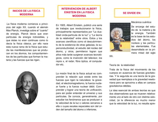 El documento resume los inicios de la física moderna en el siglo XX, incluyendo las contribuciones clave de Albert Einstein y el desarrollo de la mecánica cuántica y la teoría de la relatividad. Actualmente, la física moderna busca comprender las relaciones entre las fuerzas fundamentales de la naturaleza con el objetivo de desarrollar una teoría de la unificación.