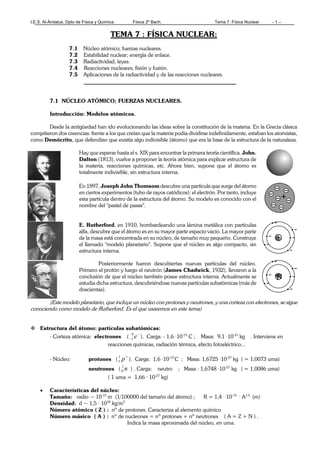Este documento presenta un resumen de la física nuclear. Explica la estructura del átomo y las partículas subatómicas como protones, neutrones y electrones. También describe las fuerzas nucleares que mantienen unidos los núcleos atómicos, y conceptos como la radiactividad, las leyes de desintegración radiactiva, y los tipos de reacciones nucleares como la fisión y la fusión nuclear. Finalmente, menciona algunas aplicaciones de los procesos nucleares.