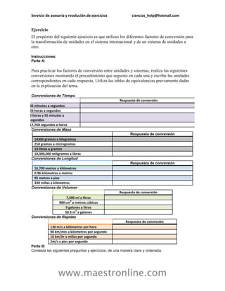 Este documento proporciona información sobre un servicio de asesoría y resolución de ejercicios de ciencias. Incluye instrucciones para realizar ejercicios de conversión de unidades, vectores y cinemática. También proporciona contacto por correo electrónico y sitio web para obtener más información sobre el servicio de tutoría en línea.