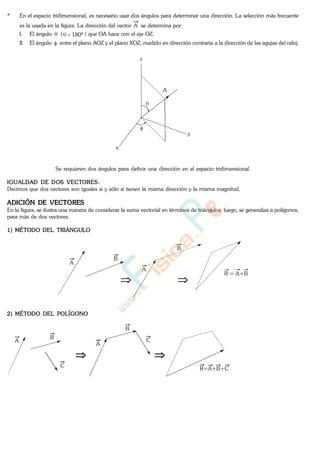 1) El documento describe las cantidades escalares y vectoriales, y define un vector geométricamente como un segmento de recta con magnitud y dirección.