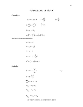 Este documento presenta fórmulas y conceptos fundamentales de física en las áreas de cinemática, dinámica, trabajo, energía, conservación de energía, impulso e ímpetu, electricidad, magnetismo, termodinámica y constantes físicas. También incluye equivalencias entre diferentes unidades de medida.