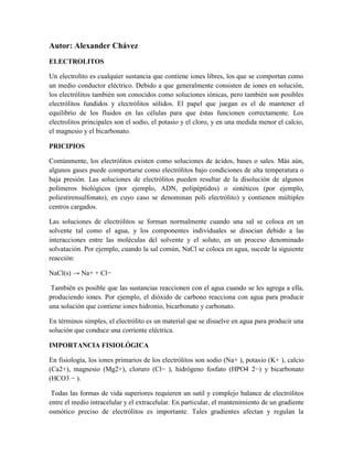 Los electrólitos son sustancias que contienen iones libres que conducen la electricidad. Los principales electrólitos en el cuerpo son el sodio, potasio, calcio y cloro. Los electrólitos se mantienen en un delicado balance entre los fluidos intracelulares y extracelulares para regular funciones vitales como la contracción muscular y la transmisión nerviosa. Cualquier desequilibrio en los niveles de electrólitos puede causar debilidad muscular, contracciones anormales o emergencias médicas si no se corrige rápidamente