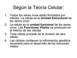 Según la teoría celular, todas las células proceden de la división de otras células, contienen la información genética necesaria para las funciones vitales, y son tanto la unidad estructural como funcional de los seres vivos. La nutrición celular implica la obtención de materia y energía a través de procesos autótrofos o heterótrofos. El metabolismo celular incluye reacciones catabólicas y anabólicas para procesar los nutrientes. Las células se comunican mediante estímulos y transportan